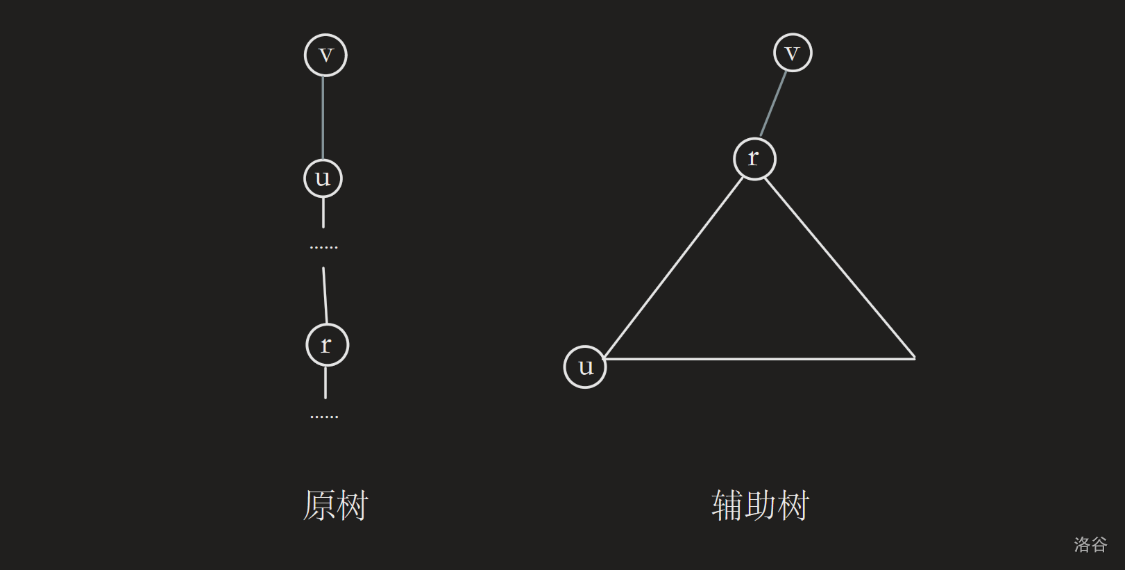 还有一点是,辅助树的虚边是认父不认子的,以上图举例,辅助树中 $fa_r=v$,但是 $son_v=\text{null}$,只有“实树”内部的边才是双向的。